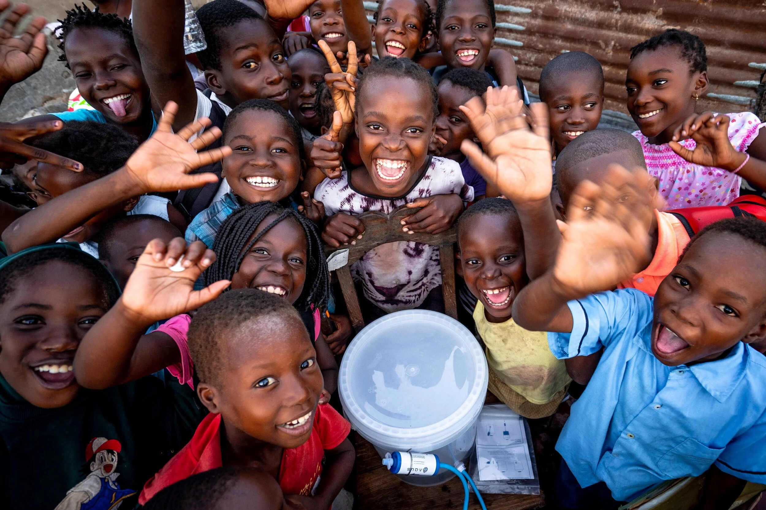 Children in Beira, Mozambique — with their new Aqus gravity water filter. [© Christopher Beyrooty]